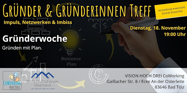 Founders, entrepreneurs and people interested in starting a business meet in a relaxed atmosphere to exchange ideas. Experienced founders give tips from their experience and like-minded people get new food for thought in joint discussions. This is followed by networking over a snack. The event offers networking opportunities for founders, young entrepreneurs and people interested in starting a business, a free exchange of experience and information in a relaxed atmosphere, short presentations of start-ups and business ideas followed by feedback and keynote speeches on exciting start-up topics. By registering, participants expressly consent to the organizers storing and processing their personal data for the purpose of holding and managing the event. This consent can be revoked at any time, whereby the revocation is only effective for the future. The photos and videos taken at the event will be used in the context of reporting in printed form, in electronic media and on the social web and will be passed on to the press, media and processors for this purpose. The event is organized by Beate Mader, owner and communication genius of VISION HOCH DREI, at Coworking Space Bad Tölz, Gaißacher Str. 8, 83646 Bad Tölz.