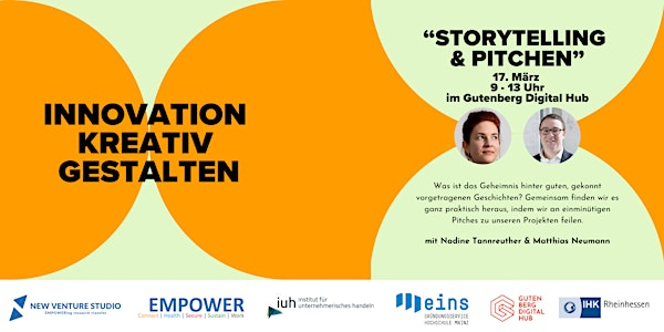 Willkommen zur Workshopreihe ‚Innovation kreativ gestalten‘ der Hochschule Mainz in Zusammenarbeit mit der IHK Rheinhessen und dem Gutenberg Digital Hub im Rahmen von EMPOWER. In diesem Workshop geht es darum, das Geheimnis hinter guten und gekonnt vorgetragenen Geschichten zu entdecken. Gemeinsam werden wir an einminütigen Pitches zu unseren Projekten arbeiten und diese verfeinern. Alle Teilnehmer:innen sollten im Vorfeld einen einminütigen Pitch vorbereiten, den sie während des Workshops präsentieren. Wer zusätzlich eine begleitende Präsentation erstellt, wird gebeten, diese bis Freitag, den 14.03.25, an Nadine Tannreuther und Matthias Neumann zu senden. Der Workshop wird von Nadine Tannreuther und Matthias Neumann geleitet. Nadine Tannreuther ist wissenschaftliche Mitarbeiterin und Doktorandin am Institut für unternehmerisches Handeln in Mainz. Sie hat einen Hintergrund in Medien- und Kommunikationsdesign mit dem Schwerpunkt Leadership in the Creative Industries und ist zudem Dozentin an verschiedenen Hochschulen. Matthias Neumann arbeitet am New Venture Studio der Hochschule Mainz und promoviert zu organisationalem Lernen. Sein Fokus liegt auf der Unternehmensinkubation und Venture Studios. Wir freuen uns auf eine kreative und inspirierende Veranstaltung! Hinweis: Während des Events können Bilder und Videos gemacht und live verbreitet werden. Durch die Teilnahme erklären Sie sich damit einverstanden. Sollten Sie nicht fotografiert oder gefilmt werden wollen, melden Sie sich bitte bei uns.