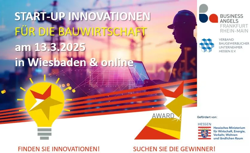 An diesem Tag werden die innovativsten Start-ups aus der Bauwirtschaft gesucht. Insgesamt acht Final-Start-ups treten beim Start-up Innovation Award im Pitch-Wettbewerb an. Die Gewinnerinnen und Gewinner werden vom Publikum, das aus Branchenvertretern besteht, gekürt. Vertreterinnen und Vertreter etablierter Unternehmen sowie Investoren können sich über innovative Produkte und Lösungsansätze in ihrer Branche informieren. Zusätzlich zu den Pitches können Interessenten vor Ort an Stehtischen direkt mit den Start-ups aus dem Wettbewerb in Kontakt treten. Die Veranstaltung findet im Heimathafen in Wiesbaden (Gerichtsstraße 2) statt. Veranstalter ist der Business Angels Frankfurt-Rhein-Main e.V. Vor dem Hauptevent gibt es ab 11.30 Uhr ein Vorprogramm, das sich mit Venture Clienting und weiteren Ansätzen zur Zusammenarbeit zwischen Start-ups und Corporates beschäftigt.